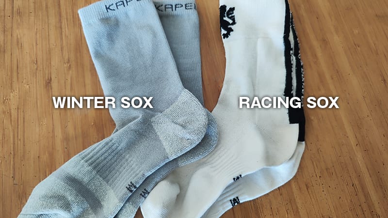 KAPELMUUR(カペルミュール)の「冬用」と「レーシングソックス」を履き比べると、当たり前ですが生地の厚さは歴然です。